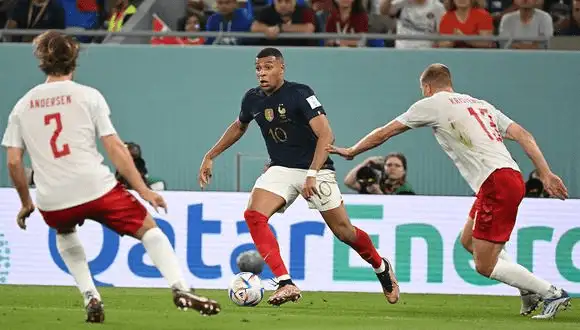 The French team , with a brace from Kylian Mbappe , beat Denmark 2-1 and qualified for the Round of 16 after achieving their second win in as many outings in group D of the Qatar 2022 World Cup .