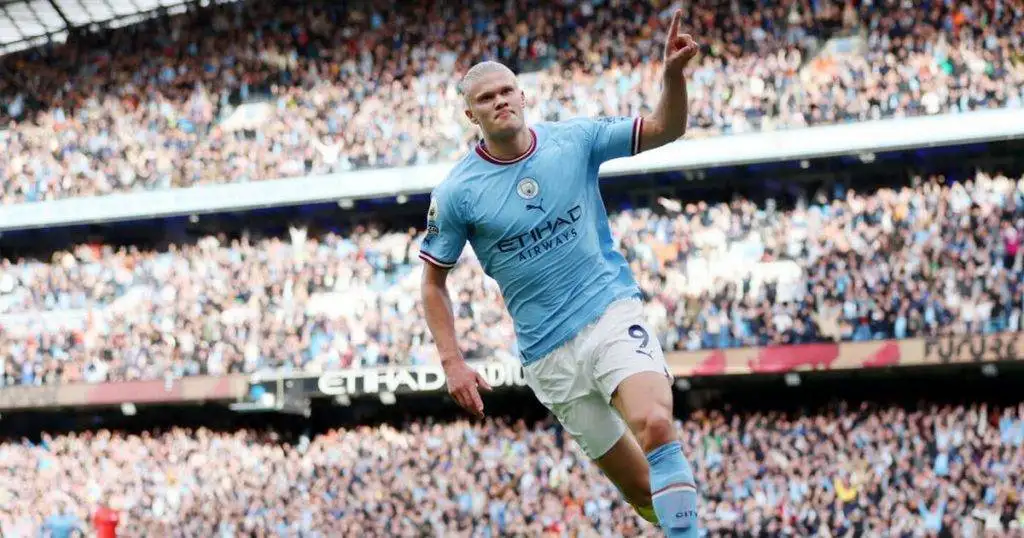 as Erling Haaland latched onto a long pass from Ederson to round Brighton goalkeeper Robert Sanchez and tap home, before firing in a terrific penalty after Lewis Dunk’s foul on Bernardo Silva.